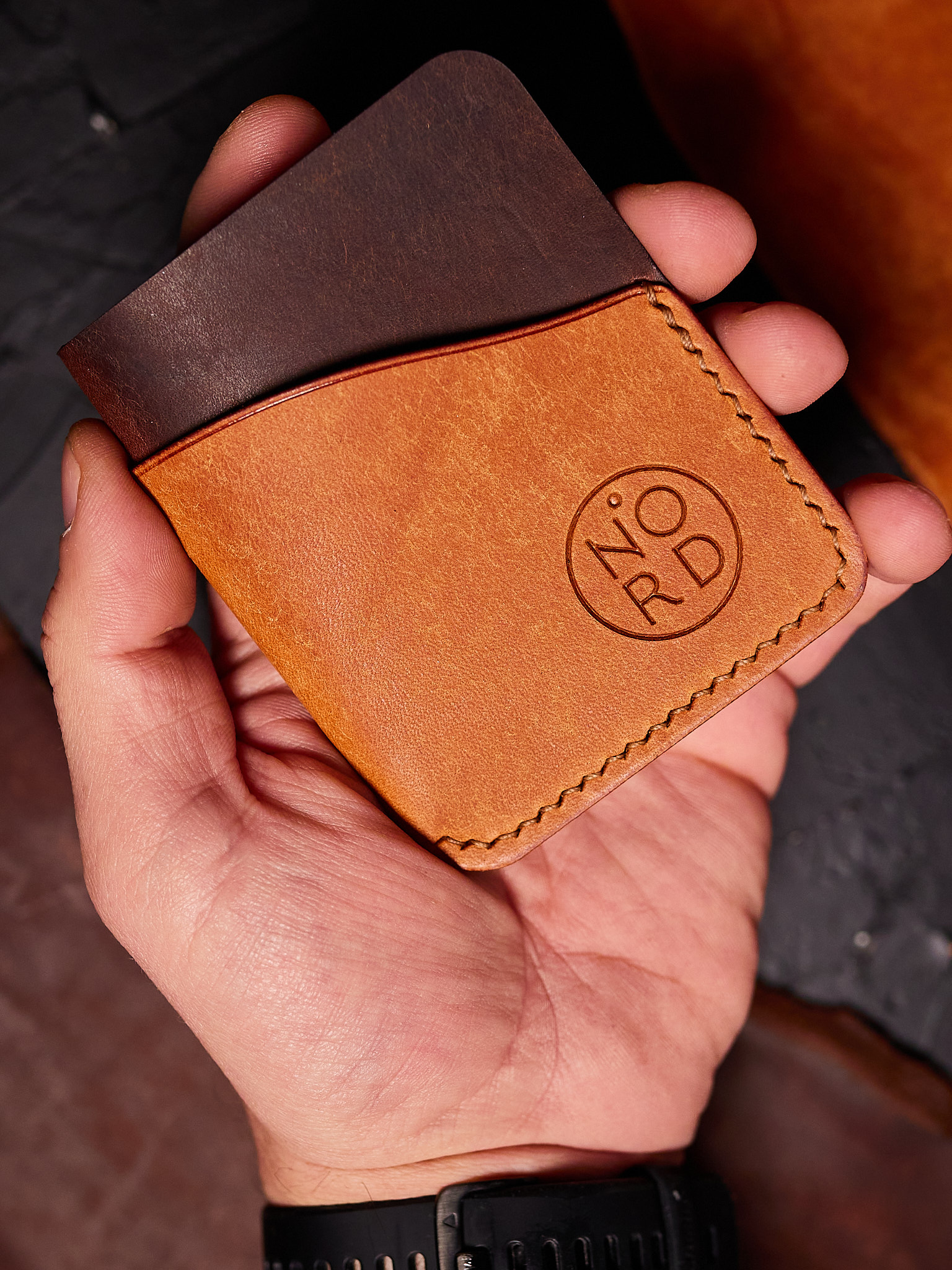 Realizat manual din piele naturală italiană MPG Chocolate și MPG Whiskey , acest portcard vertical are un design simplu și curat, dar surprinzător de încăpător. Este cusut manual cu ață japoneză OKA, o tehnică tradițională care oferă rezistență și durabilitate în timp.