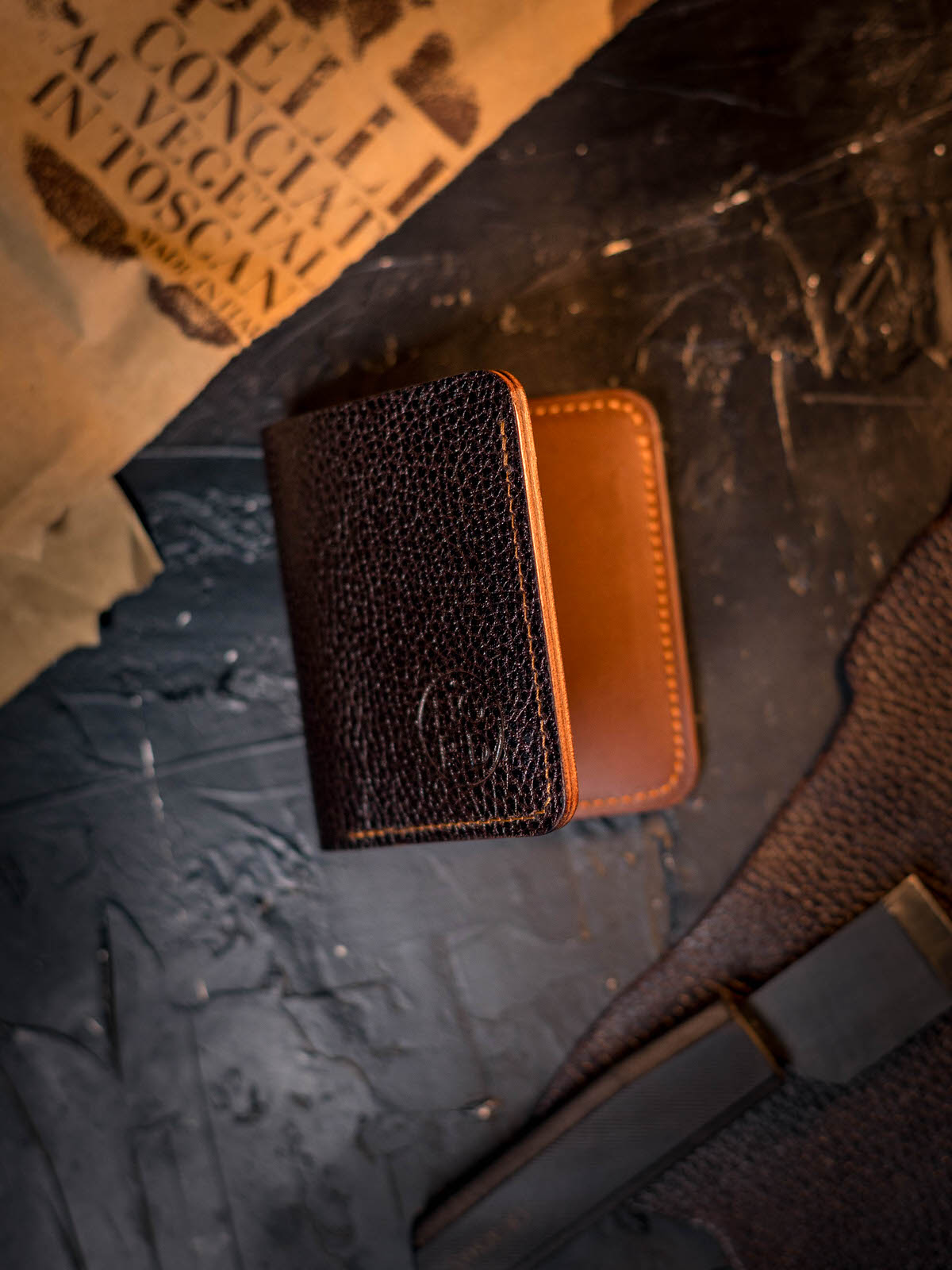 Portofelul este confecționat integral manual din piele naturală premium, tăbăcită vegetal în Toscana. Exteriorul este realizat din piele Dollaro Dark Brown de la MPG Industrial Conceria, cu textură pronunțată, iar interiorul din piele Coniac mat de la Tempesti. Cusătura este realizată manual cu ață cerată rezistentă, garantând un produs care va arăta și mai bine odată cu trecerea timpului.
